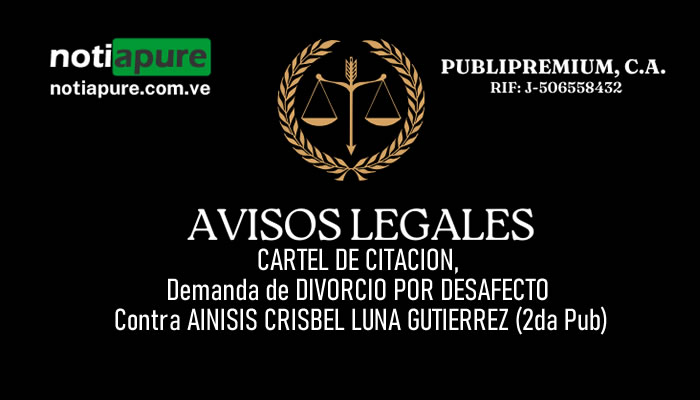Si quieres conocer otras noticias parecidas a: CARTEL DE CITACION, Demanda de DIVORCIO POR DESAFECTO Contra AINISIS CRISBEL LUNA GUTIERREZ (2da Pub) puedes visitar la categoría Avisos Legales.