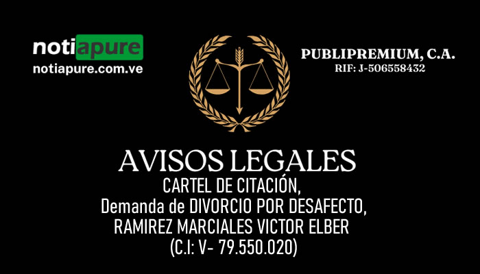 Si quieres conocer otras noticias parecidas a: CARTEL DE CITACIÓN, Demanda de DIVORCIO POR DESAFECTO, RAMIREZ MARCIALES VICTOR ELBER (C.I: V- 79.550.020) puedes visitar la categoría Avisos Legales.
