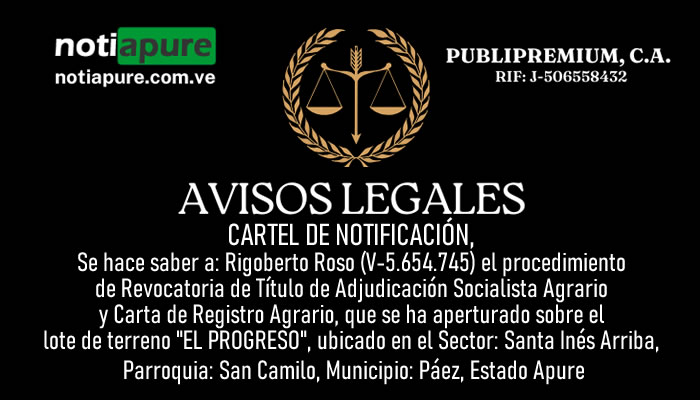 Si quieres conocer otras noticias parecidas a: CARTEL DE NOTIFICACIÓN, Se hace saber a: Rigoberto Roso, el procedimiento de Revocatoria de Título de Adjudicación Socialista Agrario y Carta de Registro Agrario, que se ha aperturado sobre el lote de terreno "EL PROGRESO", ubicado en el Sector: Santa Inés Arriba, Parr: San Camilo, Mpio: Páez, Estado Apure. puedes visitar la categoría Avisos Legales.