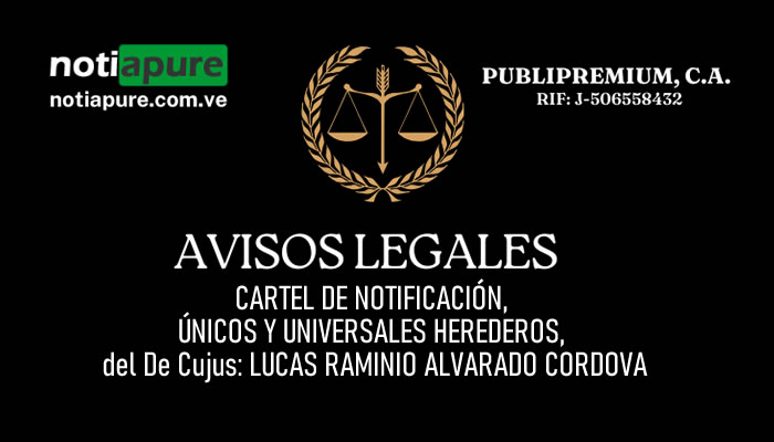 REPUBLICA BOLIVARIANA DE VENEZUELA TRIBUNAL SUPREMO DE JUSTICIA ESCUDO DE LA REPUBLICA BOLIVARIANA DE VENEZUELA TRIBUNAL SEGUNDO DE MUNICIPIO ORDINARIO Y EJECUTOR DE MEDIDAS DEL MUNICIPIO ACHAGUAS (EL YAGUAL) DE LA CIRCUNSCRIPCION JUDICIAL DEL ESTADO APURE, El Yagual, 14 de Octubre de 2025, 215° y 166°. CARTEL DE NOTIFICACIÓN. SE HACE SABER: A CUANTAS PERSONAS TENGAN INTERÉS: Que el ciudadano: LUIS ENRIQUE ALVARADO HERNANDEZ; venezolano, mayor de edad, titular de la Cédula de Identidad. No° V- 26.889.728, domiciliado en el caserío madre vieja, Parroquia Apurito Estado Apure, debidamente asistido en este acto por el Abogado en libre ejercicio RAFAEL ANTONIO LANDAETA RAMOS, inscrito en el I.P.S.A., bajo el N° 145.863. quien ha solicitado ante este Tribunal respectivamente sea declarado como UNICO Y UNIVERSAL HEREDERO, del De Cujus, identificado como: LUCAS RAMINIO ALVARADO CORDOVA, quien en vida fuera, venezolano, soltero, titular de la cédula de identidad N° V- 8.157.457, quien Fallecido ab-intestato en la ciudad de San Fernando, Estado Apure, por consecuencia de Evento Cerebro Vascular Izq/hipertensión Arterial, en fecha 16 de Septiembre del 2025, tal como consta en el Acta de defunción N°371 folio122 año 2025, En consecuencia todas aquellas personas que se crean con derecho en este procedimiento deberán comparecer ante este Tribunal, en el TERCER (3er) día de Despacho siguiente a la publicación y consignación en autos del presente CARTEL, a exponer lo conducente. Publíquese en un diario de circulación nacional, regional ben prensa digital de conformidad al artículo 110 de la Constitución de la República Bolivariana de Venezuela y el artículo 126 de la Ley Orgánica del Tribunal Supo de Justicia, y copia del mismo, fíjese en la CARTELERA de este Tribunal.- LA JUEZA PROVISORIO, DRA. MARGELYS MALUENGA. Firmado legible, EL SECRETARIO TEMPORAL ABG. OSWALDO JOSE LOVERA. Firmado ilegible. SOLICITUD N° 412-2025 (D.U.U.H). MM/OJL/PMMS