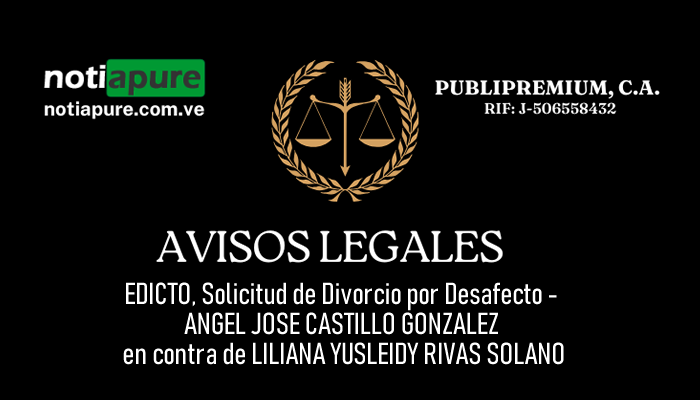 Si quieres conocer otras noticias parecidas a: EDICTO, Solicitud de Divorcio por Desafecto - ANGEL JOSE CASTILLO GONZALEZ en contra de LILIANA YUSLEIDY RIVAS SOLANO puedes visitar la categoría Avisos Legales.