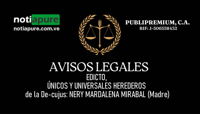 Si quieres conocer otras noticias parecidas a: EDICTO, ÚNICOS Y UNIVERSALES HEREDEROS de la De-cujus: NERY MARDALENA MIRABAL (Madre) puedes visitar la categoría Avisos Legales.
